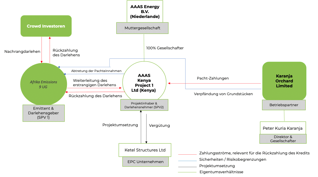 Für die Crowdfunding-Kampagnen auf bettervest wurde eine Zweckgesellschaft namens Afrika Emissions 9 UG (haftungsbeschränkt) mit Sitz in Deutschland gegründet, die bei diesem Projekt als Darlehensnehmer fungiert. Sie leitet das eingesammelte Kapital als erstrangiges Darlehen an den Projektinhaber in Kenia, AAAS Kenya Project 1 Ltd. weiter. Gesellschafter und Geschäftsführer von Afrika Emissions 9 UG (haftungsbeschränkt) sind unabhängig von dem Projektinhaber. AAAS Kenya Project 1 Ltd. ist der Projektinhaber und gleichzeitig eine Zweckgesellschaft, die von der Muttergesellschaft AAAS Energy B.V. für die lokale Umsetzung des Projekts gegründet wurde.